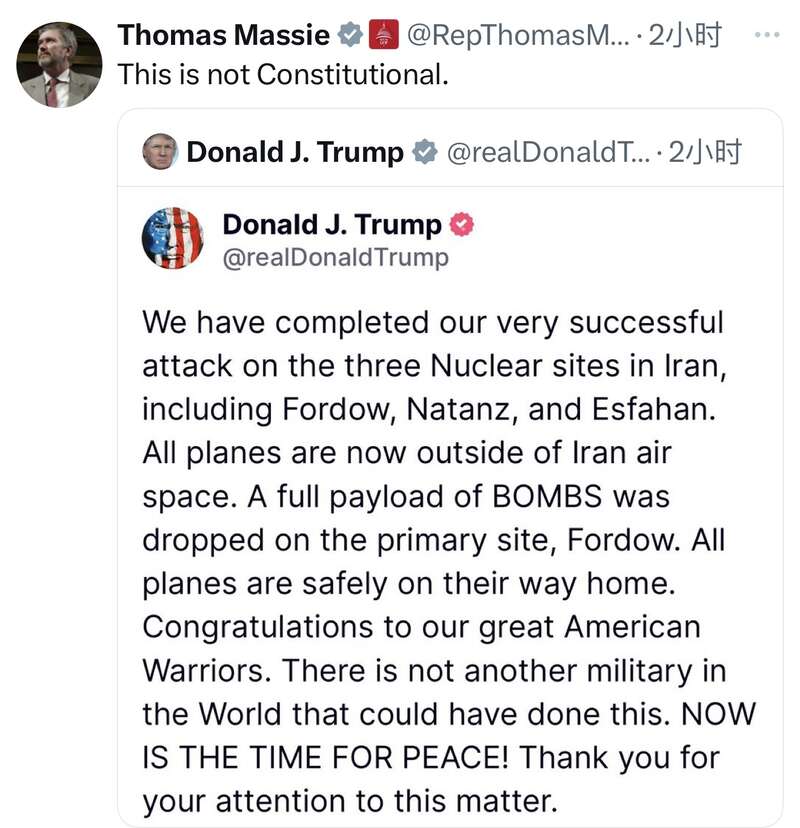 肯塔基州共和党众议员托马斯·马西在社交媒体X上转发了特朗普宣布完成打击的推文并评论称,“这不符合宪法。”