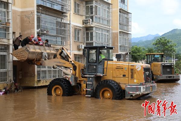 本报北京7月28日电(中青报·中青网记者 尹希宁)连续多日的暴雨后,北京市密云区太师屯镇人民政府已变成附近受灾群众“临时的家”。今天,中青报·中青网记者在密云区太师屯镇中心街看到,不少挖掘机载着附近受灾群众驶过积水,将群众分批送至镇政府。