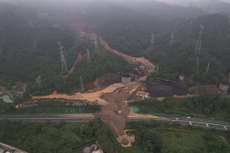 路政人员在现场看到,倾泻的砂石就像一座山,已堆至高速路上一块道路指示牌下沿,初步目测,砂石高度接近6米。无人机空中航拍显示,倾泻的砂石呈倒三角状态,上方(往湛江方向)车道最宽处约50米,完全覆盖清云高速双向车道,并漫延至下边坡(往汕头方向)外侧,初步估计滑塌的砂石约2万平方米。