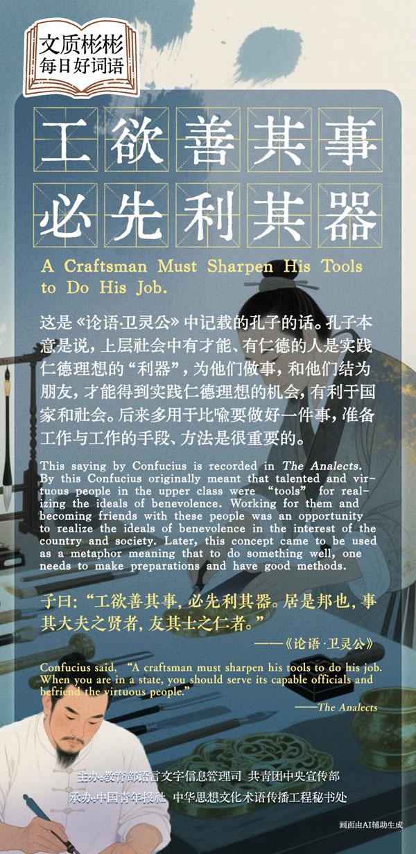 This saying by Confucius (551-479 BC) is recorded in The Analects. By this Confucius originally meant that talented and virtuous people in the upper class were "tools" for realizing the ideals of benevolence. Working for them and becoming friends with these people was an opportunity to realize the ideals of benevolence in the interest of the country and society. Later, this concept came to be used as a metaphor meaning that to do something well, one needs to make preparations and have good methods. The implied reasoning of this saying is as follows: objectives determine the choice of methods, and methods determine the realization of objectives.
