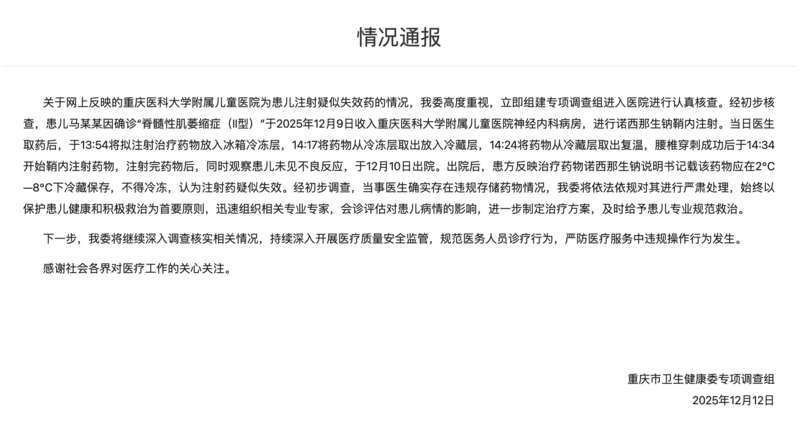 针对网上反映重庆医科大学附属儿童医院为患儿注射疑似失效药,重庆市卫健委13日通报:经初步调查,当事医生存在违规存储药物情况,将依法依规严肃处理。