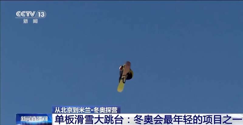 总台央视记者 杨威:大跳台项目,英文名字叫“big air”,顾名思义,运动员从一座垂直落差近50米左右的高台上沿着滑道疾驰而下,在起跳台上借助惯性将身体抛出,在短暂的滞空时间内完成空翻、转体、抓板等技术动作,最终在着陆坡完成落地。裁判们根据运动员每轮动作的难度、完成度、创意等给出自己的打分。