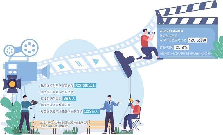 作为数字文化产业的新兴赛道,微短剧凭借轻量生产、快速迭代的特质,已成为拉动就业的新引擎。北京大学国家发展研究院近期发布的《2025年中国微短剧产业发展格局与就业拉动效应测算报告》显示,我国微短剧月产量稳定在3000部以上,形成分工明晰的产业体系,直接吸纳就业约69万人,叠加产业链乘数效应后,对全国就业市场的总体贡献突破203万人。这一新兴产业不仅消化了传统影视行业的存量就业需求,更拓展了就业增量、优化了就业结构,为不同群体提供了多元就业机会,走出了一条新业态带动高质量就业的特色路径。