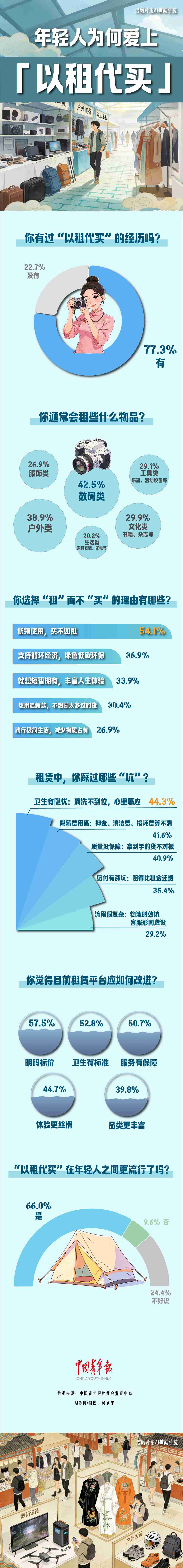 租相机、租汉服、租户外装备……如今,“以租代买”的消费模式正在年轻人中流行起来。近日,中国青年报社社会调查中心的一项调查显示,近八成(77.3%)受访青年有过“以租代买”的经历。66.0%的受访青年感觉“以租代买”的消费方式在年轻人中更流行了。数码设备(42.5%)、户外装备(38.9%)是受访青年经常租赁的两类物品。对于租赁平台,57.5%的受访青年希望价格更实惠,明码标价,减少复杂的优惠套餐。