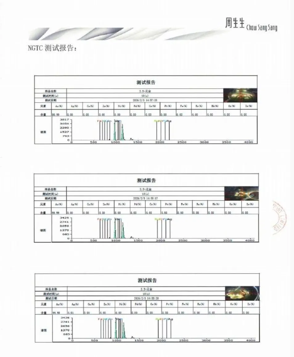 同时,今日2月3日,我司已将同批次同款福袋送检至国家珠宝玉石首饰检验集团有限公司(NGTC),采用X射线荧光光谱法(XRF)进行检测,该福袋货品的检测结论为足金饰品(报告编号:P-ZSSA2121621)。NGTC对该货品随机选取3个检测点,检测所得金含量结果依次为99.99%、99.99%、99.98%(详见附件)。