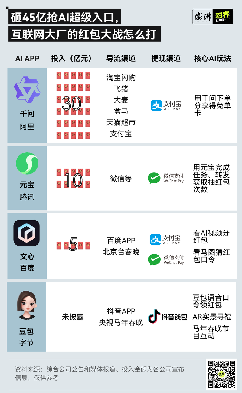 马年春节临近,互联网大厂的红包大战一触即发。与2015年微信用红包杀入支付市场不同,今年的主角变成了互联网大厂的AI应用。1月25日,腾讯旗下AI应用“元宝”宣称,用户参加活动可分10亿元现金红包。2月2日,阿里旗下AI应用千问宣称投入30亿元用于“请客”。截至2月5日的不完全统计,百度、阿里、腾讯和字节宣称的春节红包大战投入规模已高达45亿元。