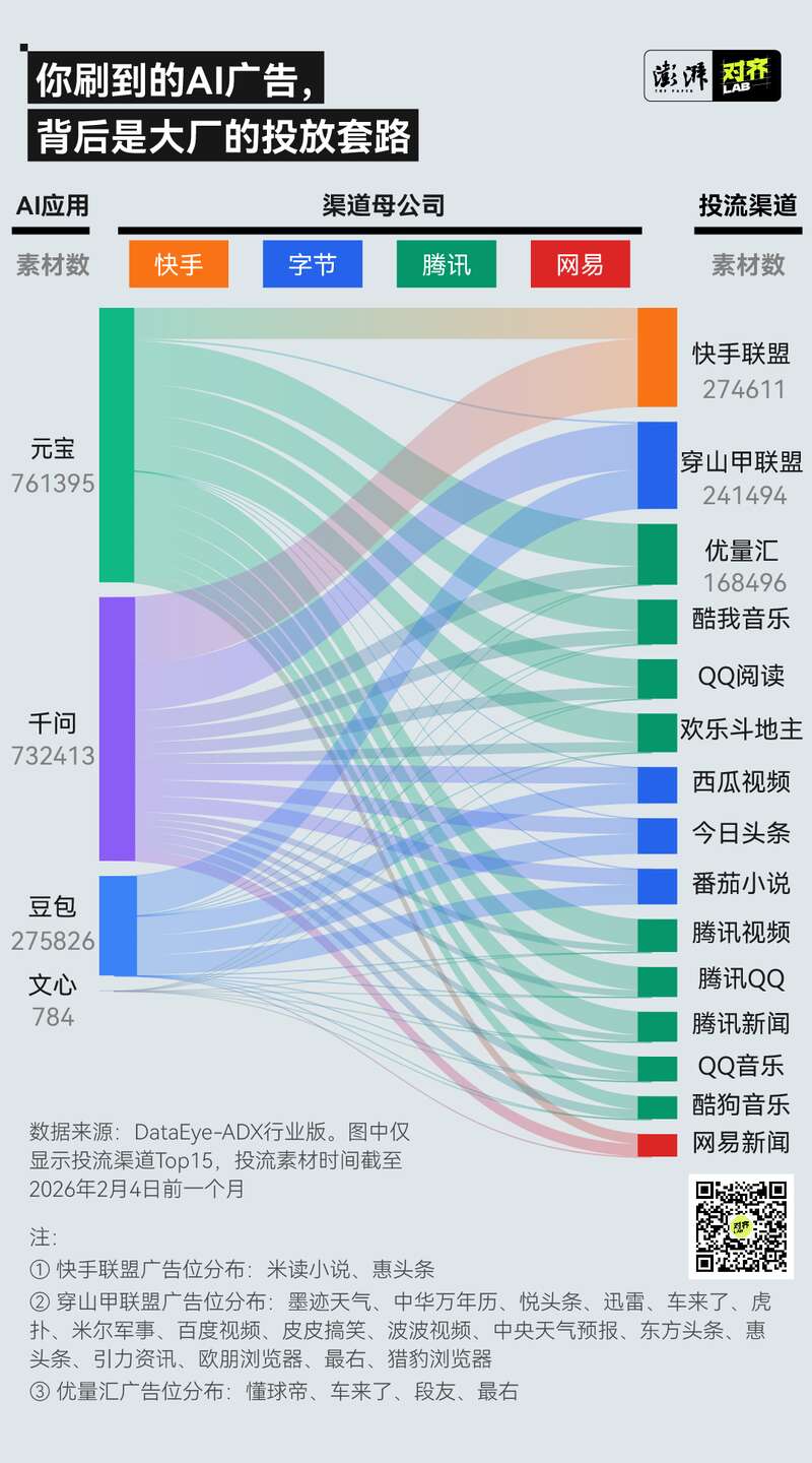 很多广告投放渠道虽然自带流量,但想在竞争对手的生态里有很高的曝光度也并非一件容易的事。在各种AI应用都投的媒体平台上,“亲儿子”的投放量总会更高。总体而言,豆包几乎不怎么投腾讯系平台,元宝几乎不怎么投字节系平台,但千问是腾讯系和字节系的平台都在投。