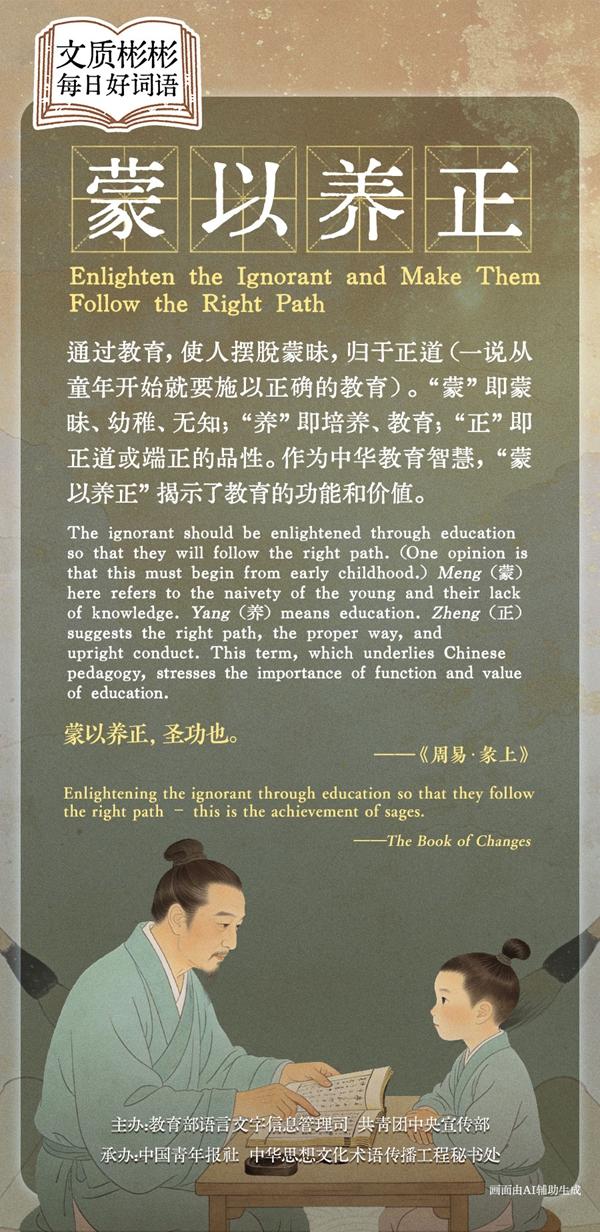 The ignorant should be enlightened through education so that they will follow the right path. (One opinion is that this must begin from early childhood.)Meng(蒙) here refers to the naivety of the young and their lack of knowledge.Yang(养) means education.Zheng(正) suggests the right path, the proper way, and upright conduct. This term, which underlies Chinese pedagogy, stresses the importance of function and value of education.