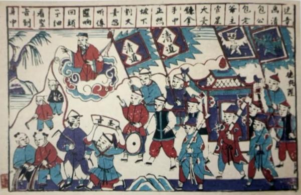 山东潍坊年画中有一个品种——《包公上任》。画面上,包公手持镰刀正在田中收割大麦,这时有一队人马抬着轿子、敲着锣鼓,迎接包公上任。人民群众希望什么样的人为官,通过这张年画不言而喻。