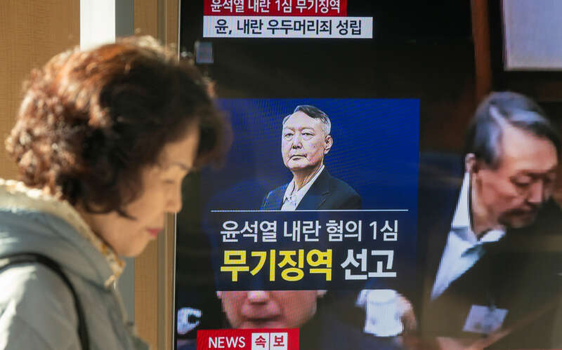 当地时间2月19日,韩国首尔,一处车站的电视屏幕正在播放关于韩国前总统尹锡悦被判无期徒刑的新闻。来自新华社的报道,韩国首尔中央地方法院2月19日宣布,韩国前总统尹锡悦内乱头目罪罪名成立,一审被判无期徒刑。同案被告、前国防部长官金龙显被判处有期徒刑30年。视觉中国供图