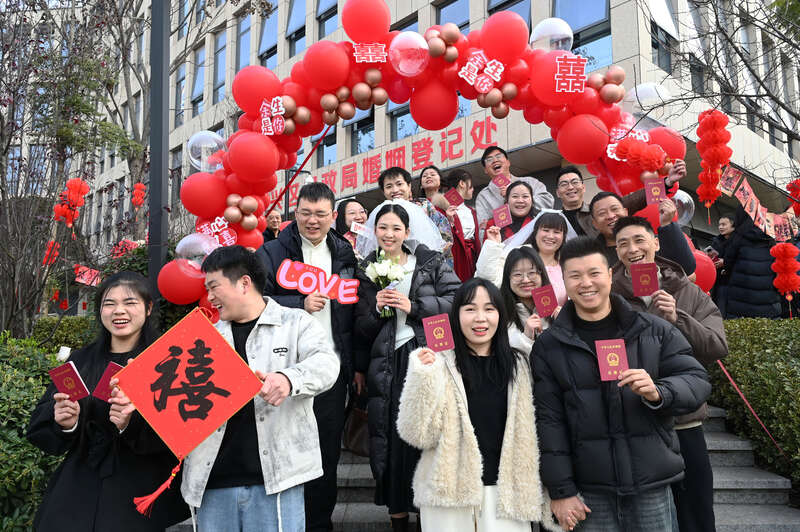 2月14日,四川内江,东兴区民政局婚姻登记处,刚领证的新人们正在拍照留念。当日是农历腊月廿七,也是春节前的最后一个工作日,许多新人选择在这一天登记结婚,让这个特别的日子见证自己甜蜜的爱情。视觉中国供图