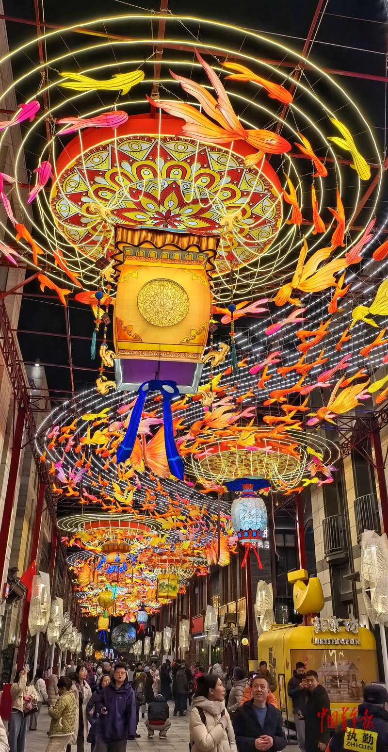 2月16日晚,农历除夕夜,位于北京前门大街旁的廊房头条,市民和游客正在观赏花灯。春节前夕,这里的花灯在夜间点亮,迎接即将到来的丙午马年。中青报·中青网记者 李建泉/摄