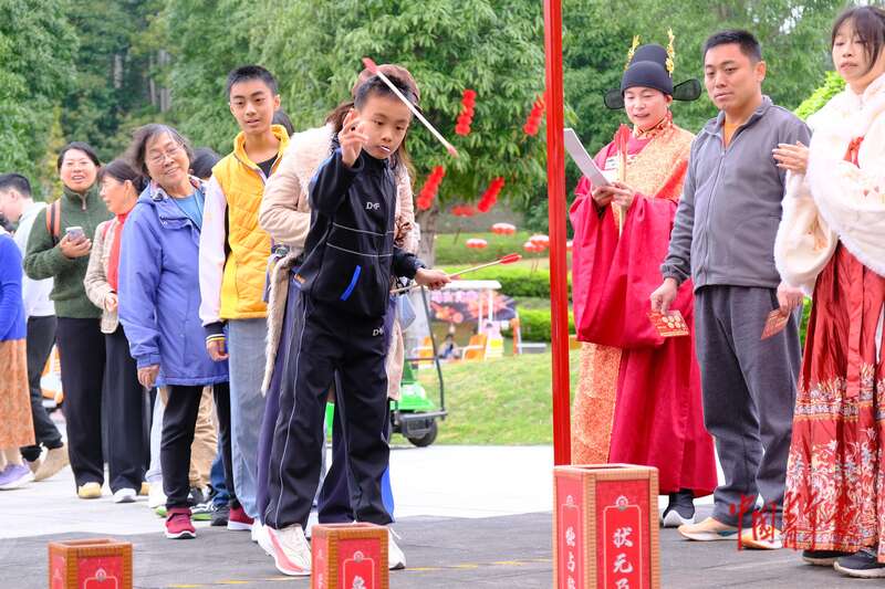 2月17日,农历正月初一,广西南宁,南宁园博园景区内,游客排队参加“马上得禄”智慧投壶游戏。中青报·中青网记者 尹希宁/摄