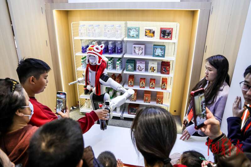 2月18日,北京,国家会议中心二期,2026大都新春庙会,售货机器人为顾客递饮料。据介绍,该机器人与2026年总台春晚舞台上亮相的机器人系同款。中青报·中青网记者 陈思阳/摄