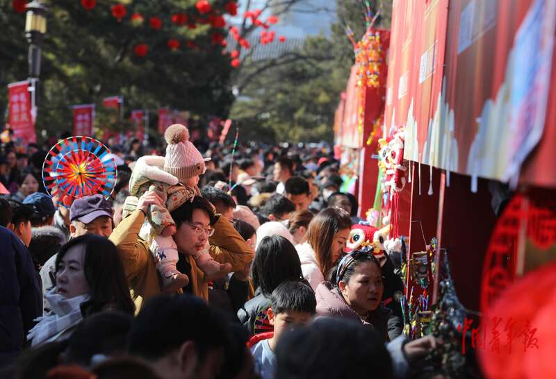 2月17日,北京地坛公园,一位父亲把孩子举在肩膀上逛庙会。当日,正值农历正月初一,第三十八届地坛春节文化庙会拉开帷幕。中青报·中青网记者 陈剑/摄