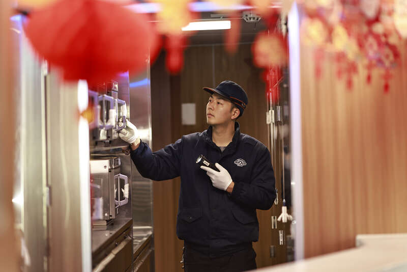 2月16日,农历除夕,重庆车辆段重庆北动集运用车间的机械师文波对动车组厨房设备进行检查。春节假期期间,当千家万户沉浸在马年新春的团圆喜庆中时,还有不少人因为工作需要,坚守在工作岗位。苏志刚/摄
