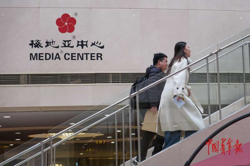 2月27日,北京梅地亚中心,两名记者上楼准备领取记者证。中青报·中青网记者 田嘉硕/摄