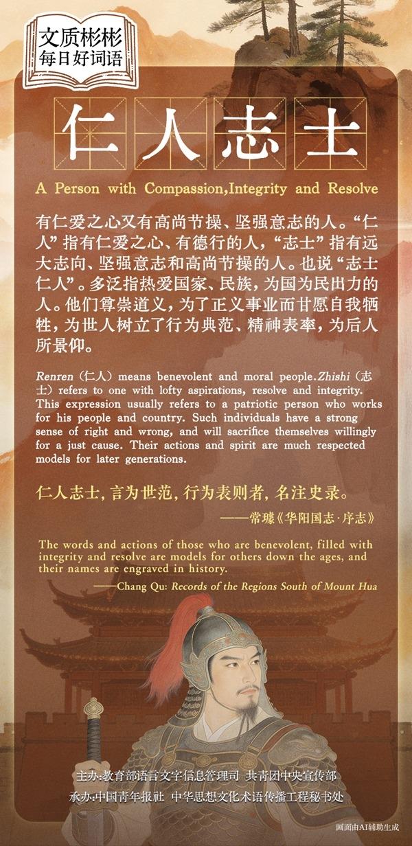 Renren means benevolent and moral people. Zhishi refers to one with lofty aspirations, resolve and integrity. This expression usually refers to a patriotic person who works for his people and country. Such individuals have a strong sense of right and wrong, and will sacrifice themselves willingly for a just cause. Their actions and spirit are much respected models for later generations.