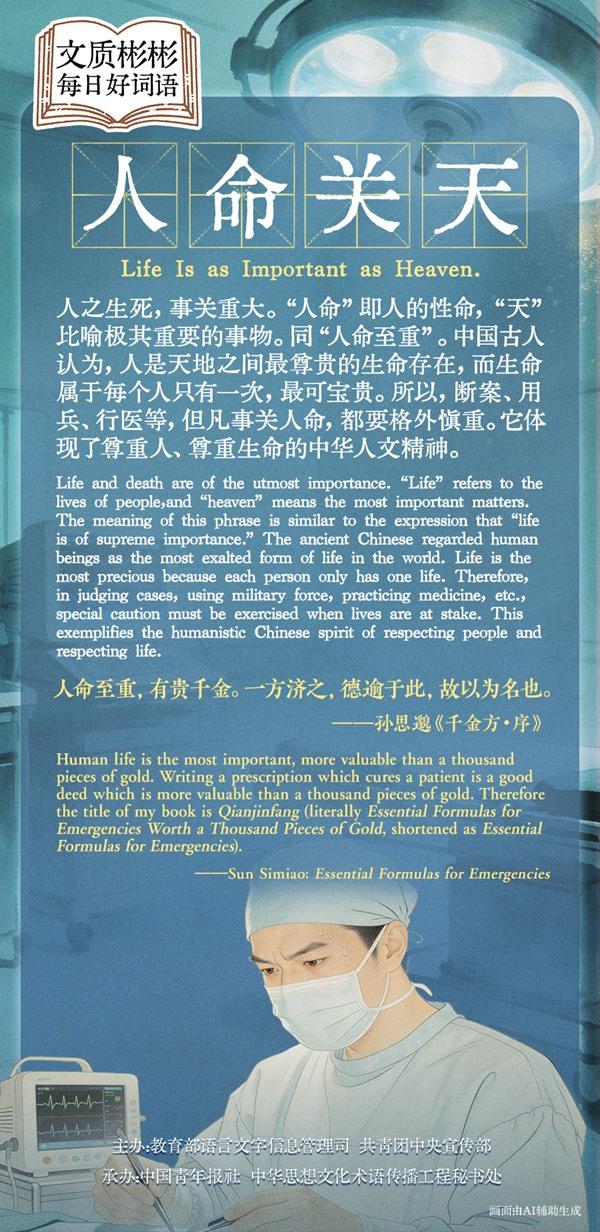 人之生死,事关重大。“人命”即人的性命,“天”比喻极其重要的事物。同“人命至重”。中国古人认为,人是天地之间最尊贵的生命存在,而生命属于每个人只有一次,最可宝贵。所以,断案、用兵、行医等,但凡事关人命,都要格外慎重。它体现了尊重人、尊重生命的中华人文精神。