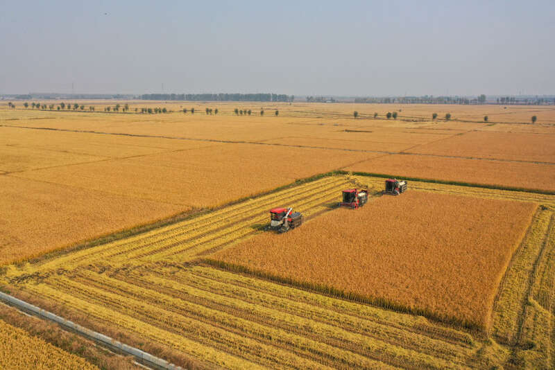 在吉林省公主岭市,吉林省米兜种植农民专业合作社进行机械化收割水稻作业展示(2025年10月14日摄,无人机照片)。新华社记者 张楠 摄
