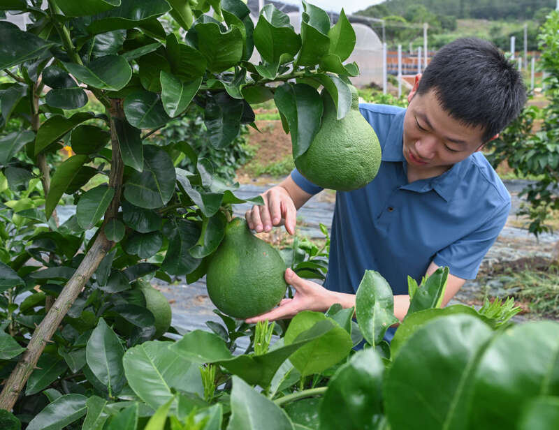 工作人员在广东省梅州市梅县区农业科学研究所检查柚子生长情况(2025年6月12日摄)。新华社记者 肖恩楠 摄