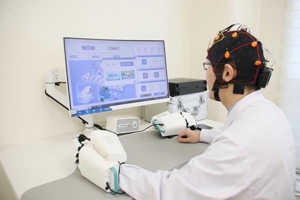 诊室里的一张桌子上,放着一个脑电帽、一副耳机、一台显示屏和一双像手套一样的机械臂——这就是一套非侵入式脑机接口设备,也是该门诊目前主要的治疗方式。有创的侵入式脑机接口仍在临床研究阶段。