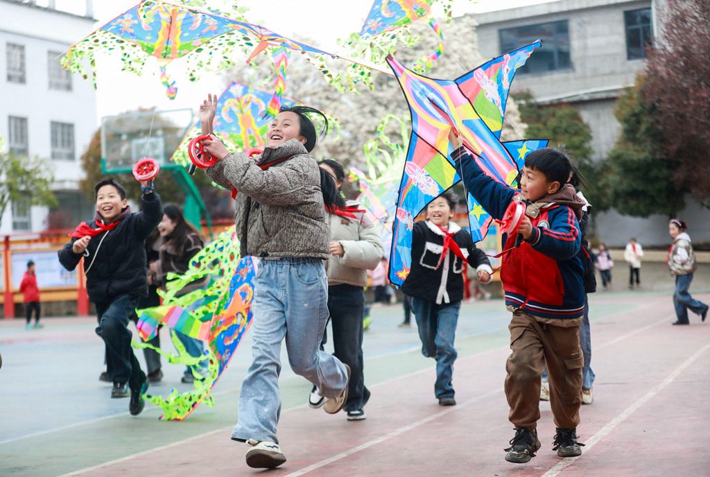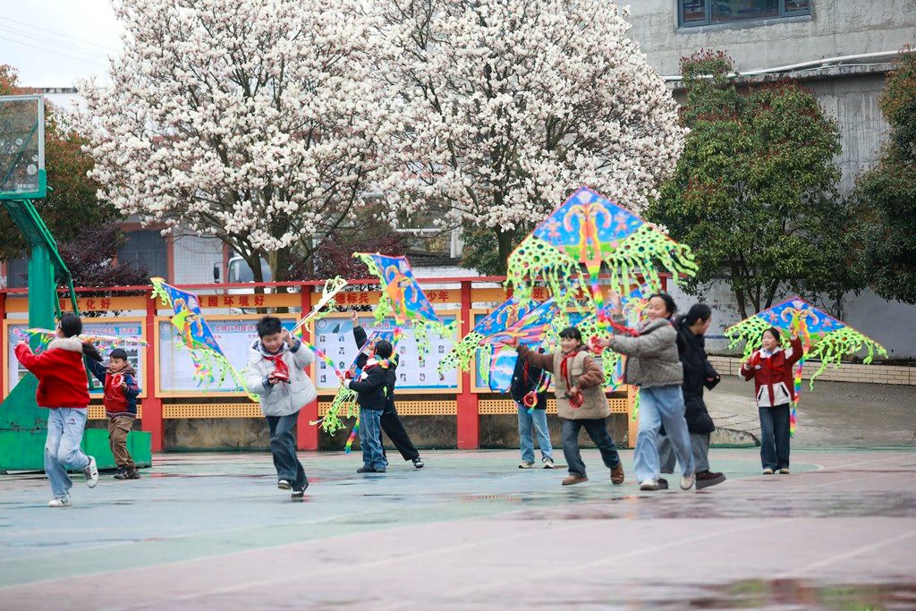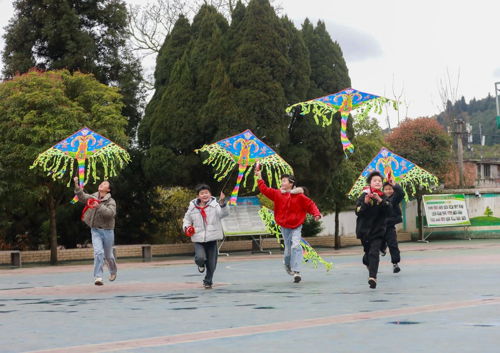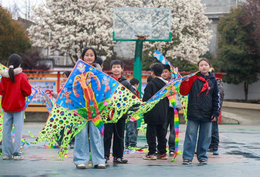 2026年3月18日,贵州黔西,观音洞镇沙井小学开展“放风筝 享春光”活动,让孩子们体验运动乐趣,愉悦身心,感受春天的气息。