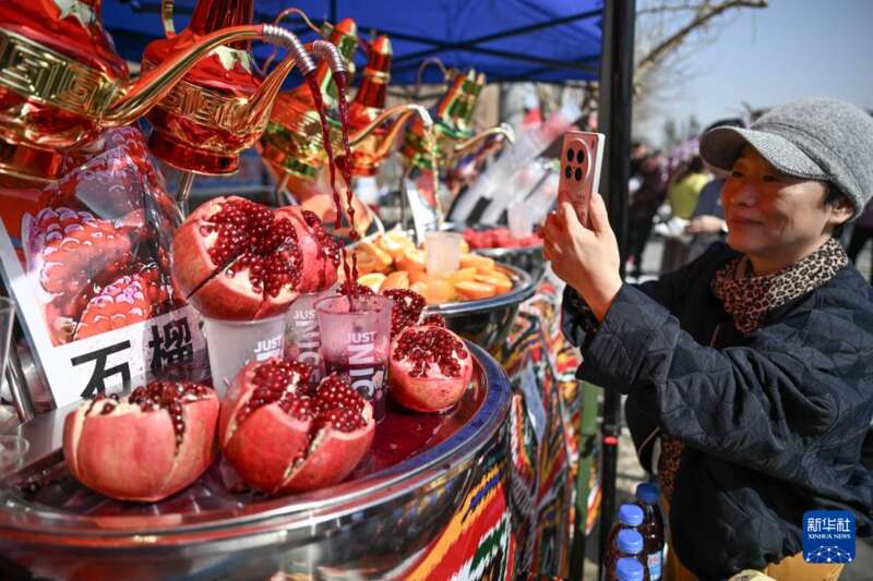 3月20日,在新疆吐鲁番市托克逊县南湖杏花村,游客拍摄当地特色饮品。