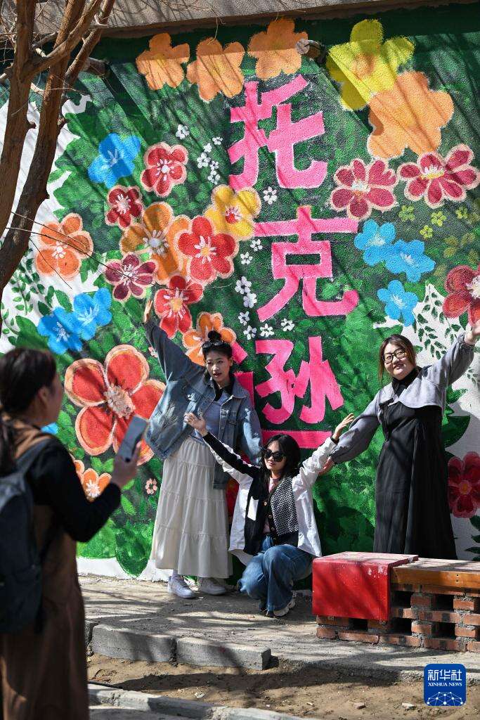3月20日,游客在新疆吐鲁番市托克逊县南湖杏花村打卡拍照。