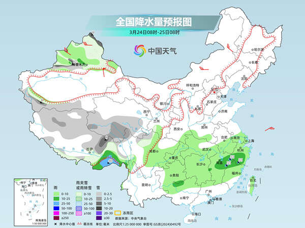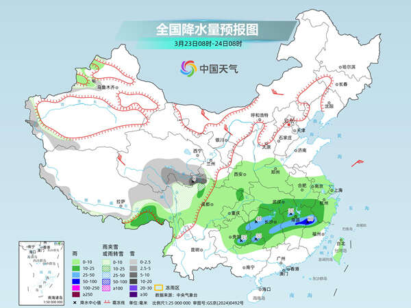 后天,随着暖湿气流减弱,南方的降雨将再次进入减弱阶段。预计,新疆北部和南部山区、西藏大部、青海中南部、川西高原北部等地部分地区有小到中雪或雨夹雪,其中,新疆北部和南部山区、西藏东部等地部分地区有大雪或暴雪。西藏东南部、江淮大部、江汉大部、江南、西南地区东部、华南北部、台湾岛大部等地部分地区有小到中雨,其中,江西东部、浙江南部、西藏东南部等地部分地区有大雨。