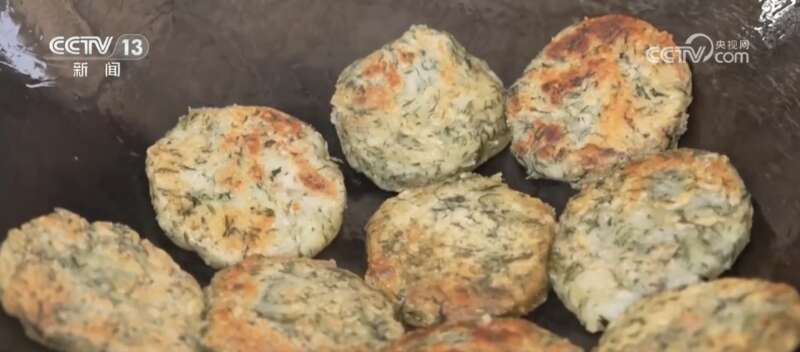 做蒿子粑,选料是第一步。早上新鲜采摘的蒿子清香扑鼻,清洗后焯一下水就能去除它的苦涩味。熬煮好的腊肉蒿子汤倒入糯米和籼米混合的米粉中,揉搓成小团再压扁。起锅烧油煎至双面酥黄,蒿子粑就做好了。在桐城市,蒿子粑还走进工厂,进行规模化生产,通过直播进行线上销售,深受消费者喜爱。