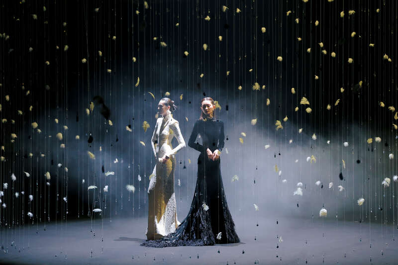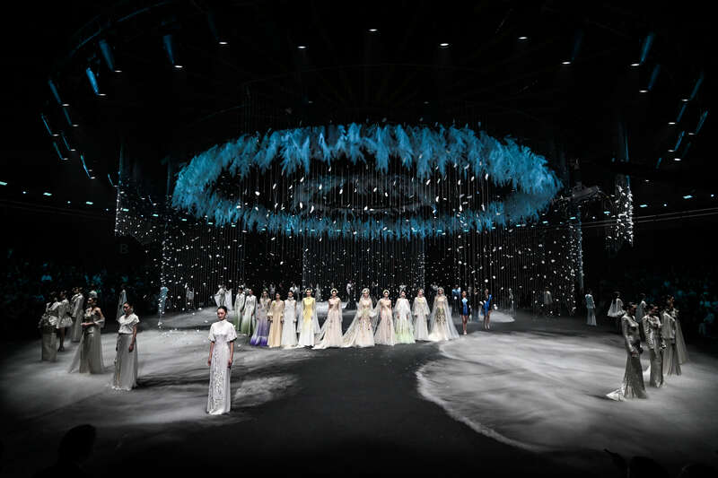 本季开幕秀由时装品牌“熊英·盖娅传说”完成。开幕秀将四季融入设计脉络,通过沉浸式自然意境打造视觉盛宴,用灯光与装置交织出空灵浪漫的氛围。开幕秀作品在设计上大量展示东方美学,融合苏绣、盘金绣、钉珠等非遗手工技艺,搭配轻盈飘逸的面料与层次丰富的剪裁,将山水意境、花鸟纹样与现代廓形完美结合,尽显东方华服的雅致与气场。