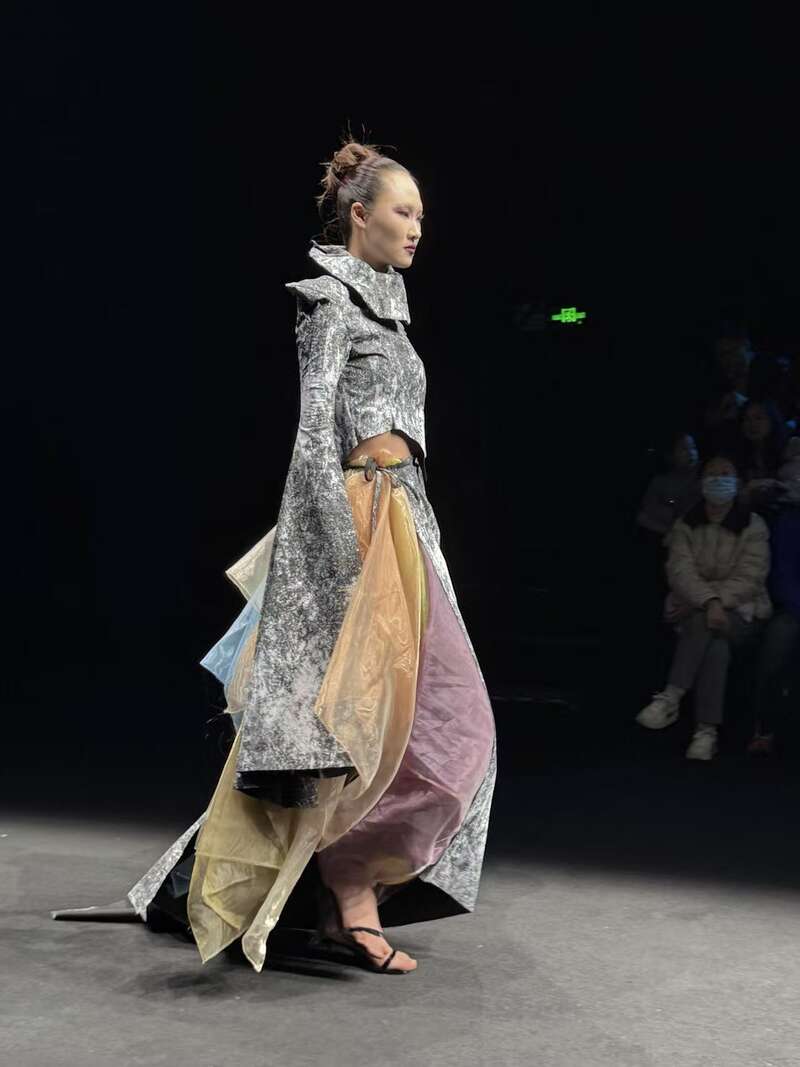 小设计师们携创意针织系列亮相舞台。作品以纱线重构传统针织技法,形成立体肌理,刻意保留的手缝痕迹,赋予服装手作温度,令成衣化作可穿的织物雕塑。中青报·中青网记者 夏瑾/摄