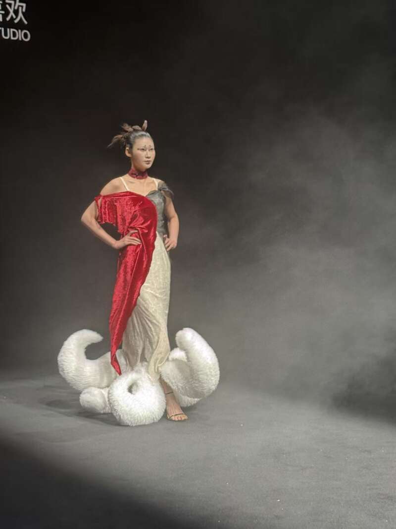 小设计师将《山海经》中的“九尾狐”元素融入服装设计,用极致的色彩碰撞与夸张廓形重构出神兽的视觉冲击力。中青报·中青网记者 夏瑾/摄