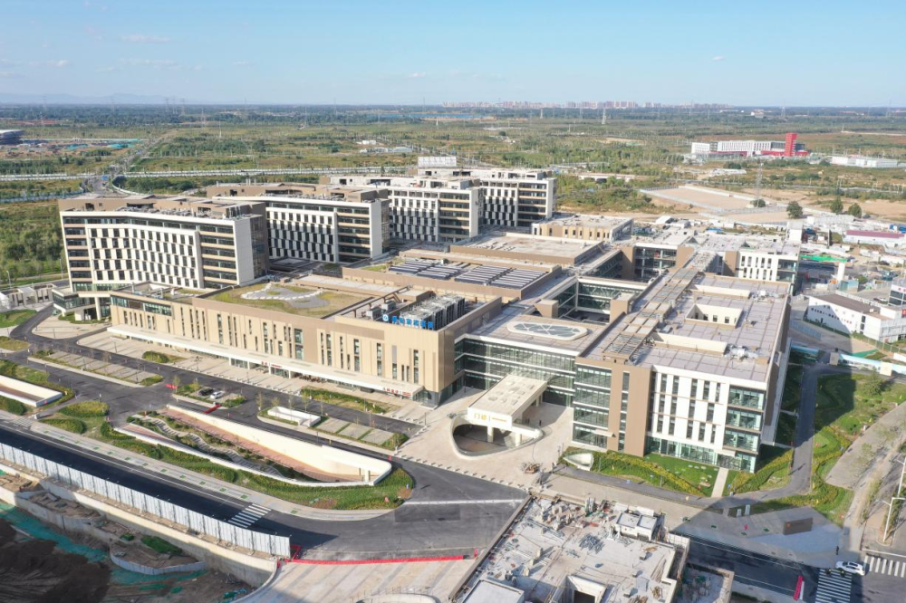 2023年6月30日,中共中央政治局召开会议,审议《关于支持高标准高质量建设雄安新区若干政策措施的意见》。此后,一揽子特殊支持政策陆续落地雄安新区。2023年10月16日,雄安宣武医院开诊。首都医科大学宣武医院派来管理团队及骨干医生,重点服务疏解人员和新区群众,并辐射京津冀地区。这是2023年9月30日拍摄的雄安宣武医院(无人机照片)。