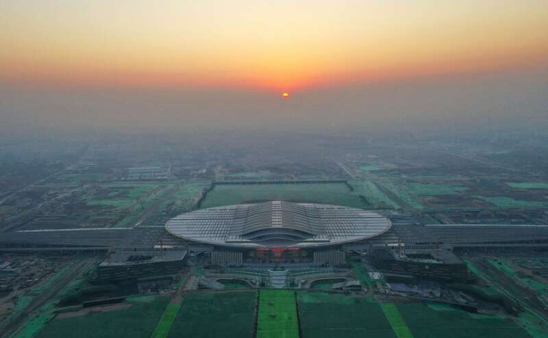 千年大计,交通先行。京雄城际铁路雄安站,是雄安新区首个重大交通项目。2020年12月27日,京雄城际铁路全线贯通,雄安站同步投入使用。这是2020年12月27日清晨拍摄的雄安站(无人机照片)。