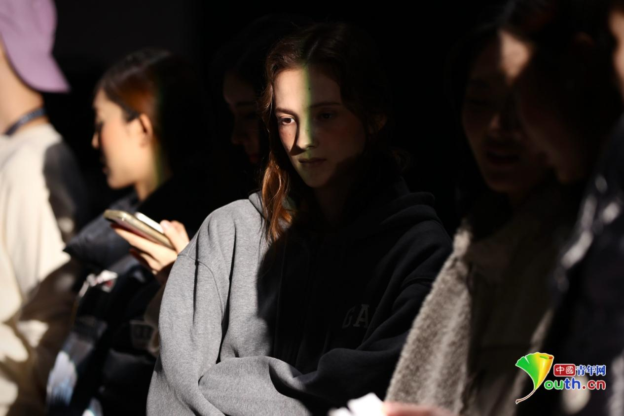 3月23日,北京798·751园区,二十余位模特正在等待彩排次日将要进行的大秀。本季时装周首发首秀达120余场,涵盖高端定制、潮流女装、童装配饰、面料科技,全方位展现全球时尚前沿趋势与中国设计力量,知名国际品牌与一众国民品牌与行业标杆品牌齐聚亮相。记者 杨逸凡/摄