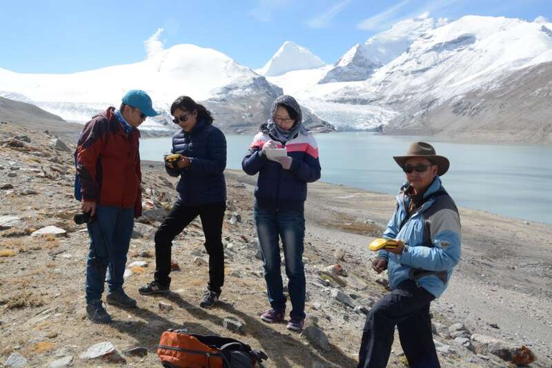 扎西央宗(左二)和团队成员在日喀则桑旺错冰川进行数据采集。(受访单位供图)