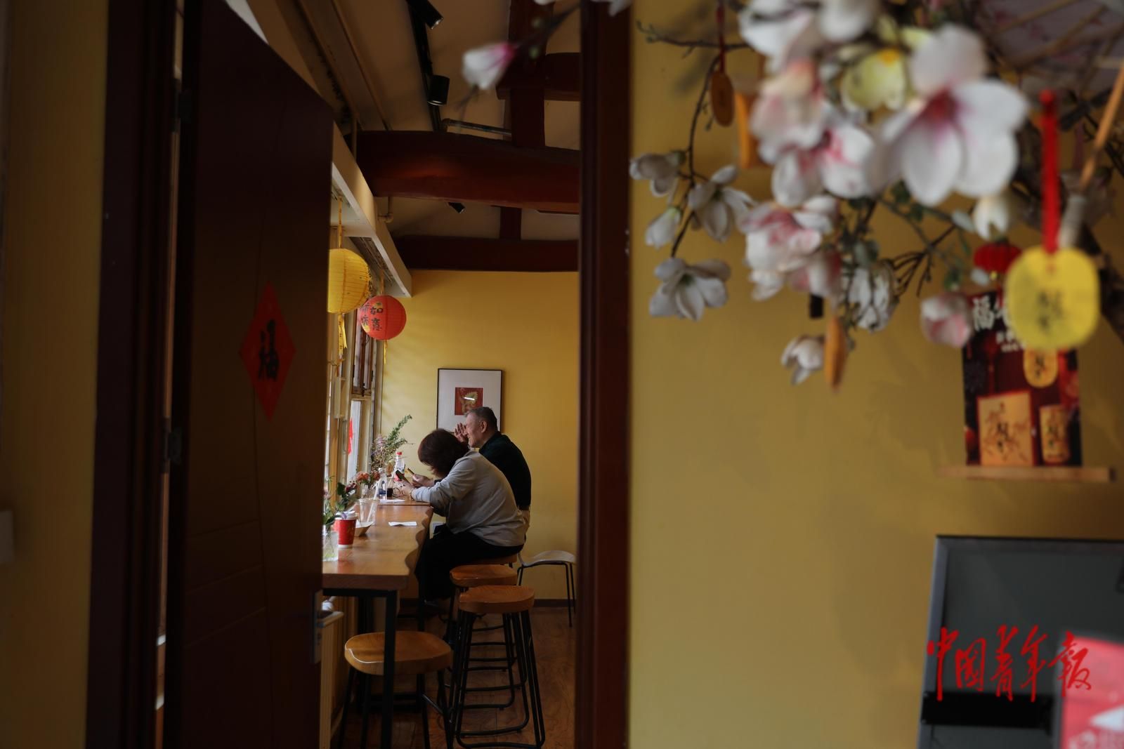 3月26日,北京市门头沟区潭柘寺景区,一家网红咖啡厅中布置着玉兰花装饰。中青报·中青网记者 孔斯琪/摄