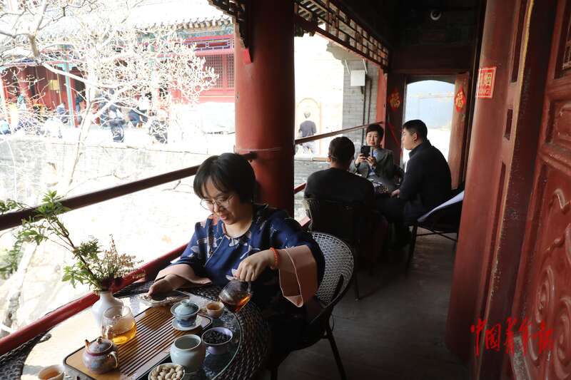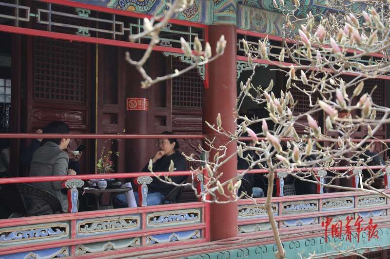 3月26日,北京市门头沟区潭柘寺景区,游客在有着近400年历史的二乔玉兰旁喝茶聊天。中青报·中青网记者 孔斯琪/摄