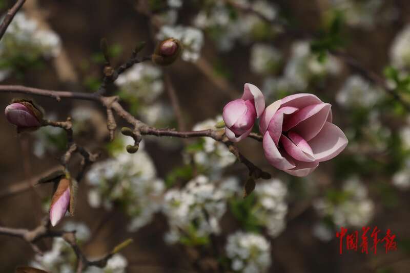 3月26日,北京市门头沟区潭柘寺景区,绽放的二乔玉兰。据介绍,二乔玉兰又名朱砂玉兰,是白玉兰与紫玉兰的杂交品种。其花瓣外紫内白、双色渐变,娇艳动人,有人将其比作三国时期东吴的大乔、小乔两位美人,故得名“二乔玉兰”。中青报·中青网记者 孔斯琪/摄