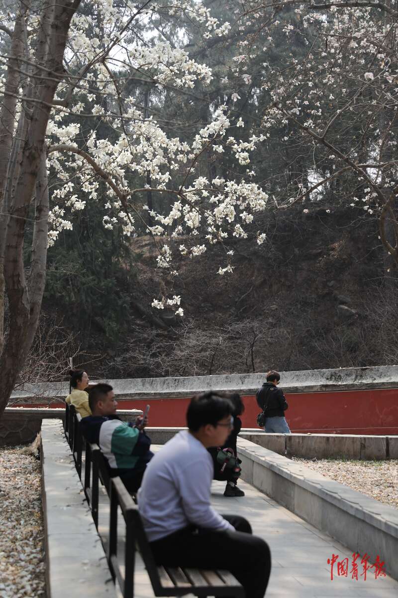 3月26日,北京市门头沟区潭柘寺景区,游客们在玉兰花下休息。中青报·中青网记者 孔斯琪/摄