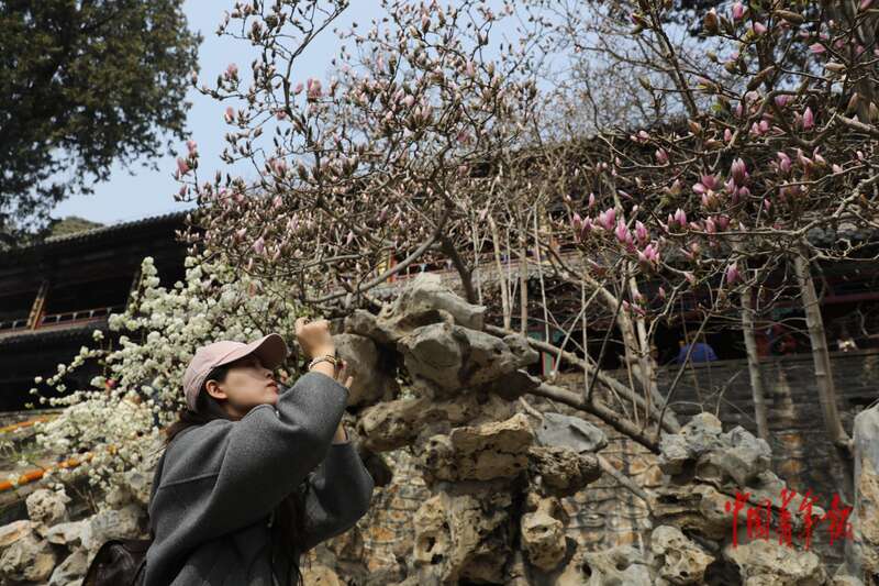 3月26日,北京市门头沟区潭柘寺景区,一名游客正在拍摄有着近400年历史的二乔玉兰。近日,潭柘寺景区内的二乔玉兰迎来最佳观赏期。据介绍,这两株二乔玉兰是全国罕见的明代古双色玉兰,高约10米,树龄400余年。3月28日,以“福地春韵 玉兰醉京”为主题的2026年潭柘寺玉兰观赏季将正式拉开帷幕,这场为期10天的春日文旅盛宴,将为京城游客带来“观玉兰、品文化、享雅趣”的一站式春日体验。中青报·中青网记者 孔斯琪/摄