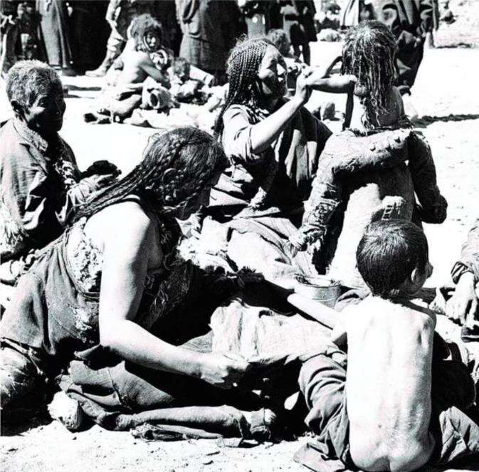 旧西藏的妇女和儿童在街上乞讨。新华社发