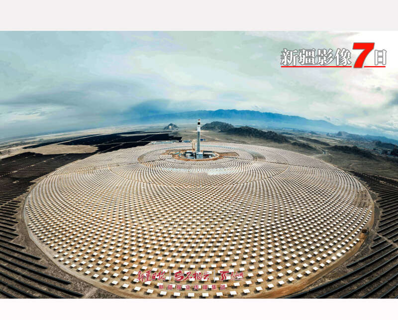 4月11日,在博尔塔拉蒙古自治州10万千瓦储热型光热配建90万千瓦新能源项目建设现场,上万面定日镜在荒漠上铺展成巨大的同心圆,朝着中央的吸热塔有序排列,高耸的吸热塔矗立在阵列中心,成为这片戈壁新能源基地的核心地标。 王敦生摄