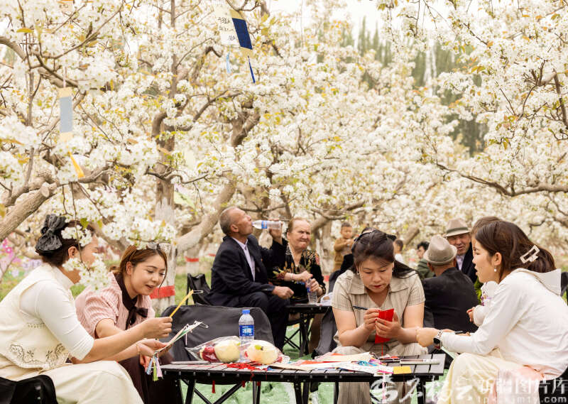 4月11日,库车市阿拉哈格镇举办 “梨香满径 春润龟兹” 主题活动,活动现场设置游园赏花、美食品尝、儿童乐园等多个体验项目,吸引不少市民与游客前来踏青赏景,共赴春日之约。图为游客在梨园里享受美好时光。袁欢欢摄