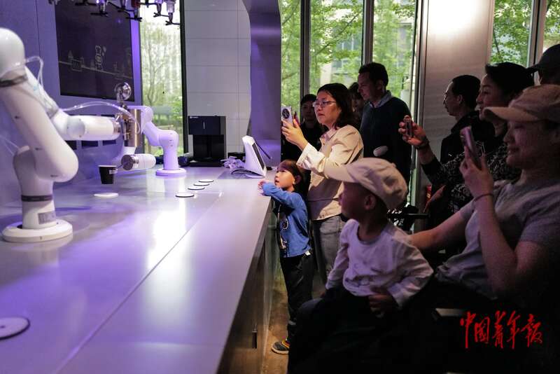 4月19日, 北京经济技术开发区,智能机器人主题2.0餐厅,顾客在参观机器人调制咖啡。中青报·中青网记者 赵迪/摄