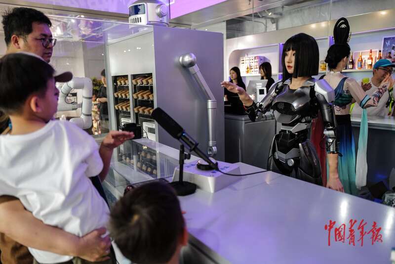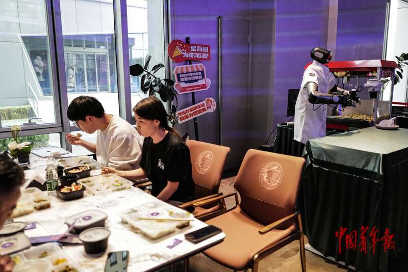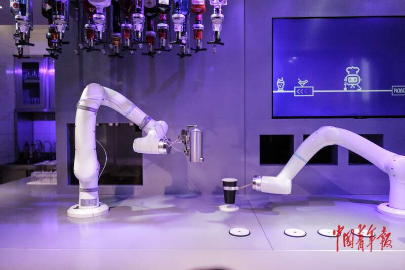 4月19日, 北京经济技术开发区,智能机器人主题2.0餐厅,机器人在烹调饮品。据介绍,这里构建了前台点餐、用餐配送、用餐氛围、餐后清洁、休闲互动、亲子体验等八大核心机器人应用场景。中青报·中青网记者 赵迪/摄
