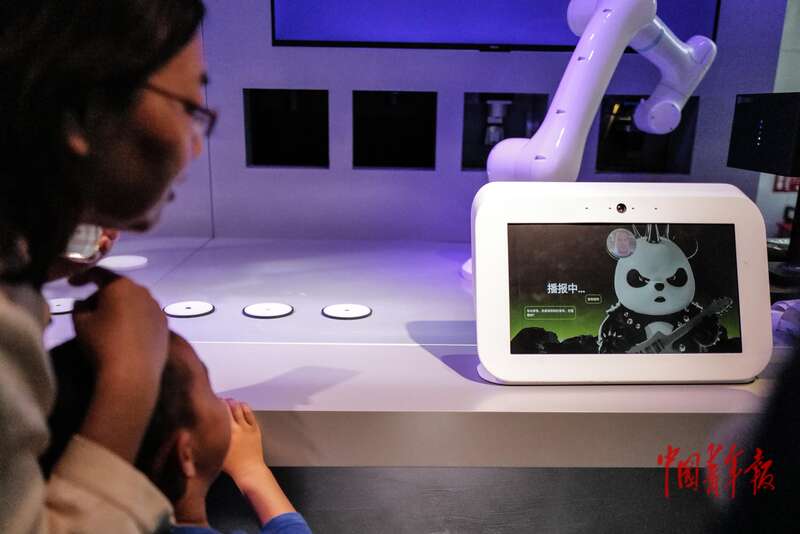 4月19日,北京经济技术开发区,智能机器人主题2.0餐厅,一名家长和小朋友在参观后厨烹饪机器人。“机器人厨师”可以制作红烧肉、荷兰豆炒腊肠、时蔬炒虾仁等经典菜。中青报·中青网记者 赵迪/摄