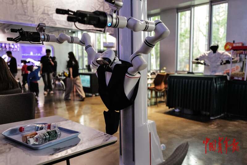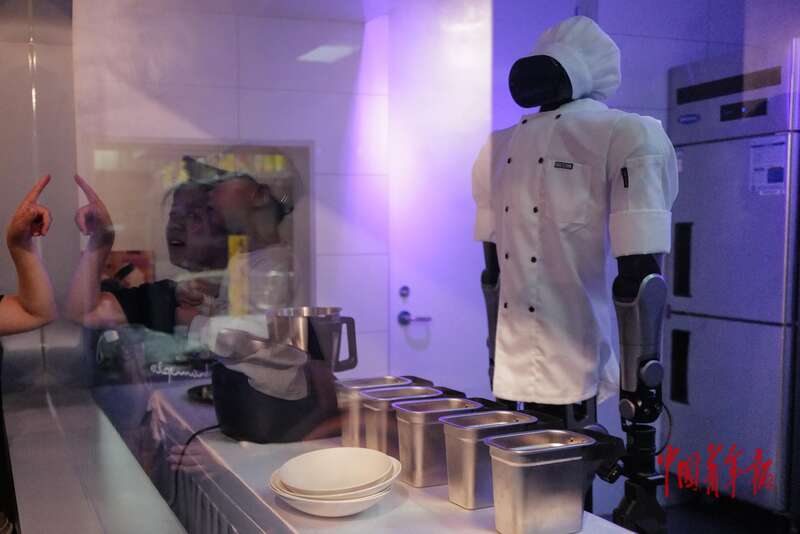 4月19日, 北京经济技术开发区,智能机器人主题2.0餐厅,前台机器人在和顾客互动。当天,2026北京亦庄半程马拉松暨人形机器人半程马拉松开赛,这里也开启试运营。据介绍,2.0餐厅从迎宾、后厨烹饪、餐食配送到餐后清理都由机器人提供全流程服务,致力于以“科技+餐饮+体验”的模式打造沉浸式机器人服务空间。中青报·中青网记者 赵迪/摄